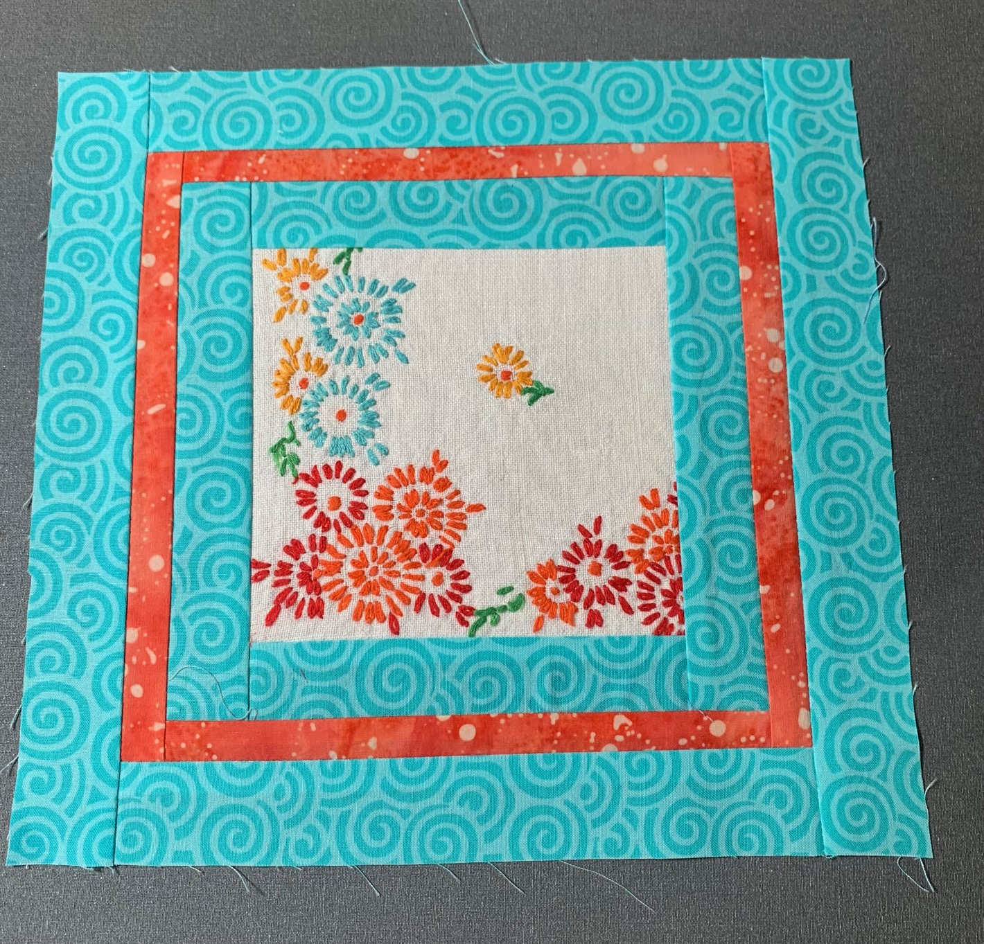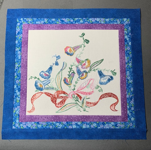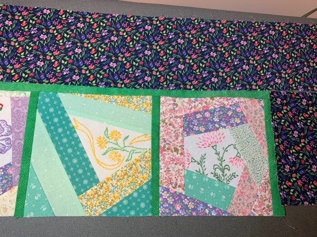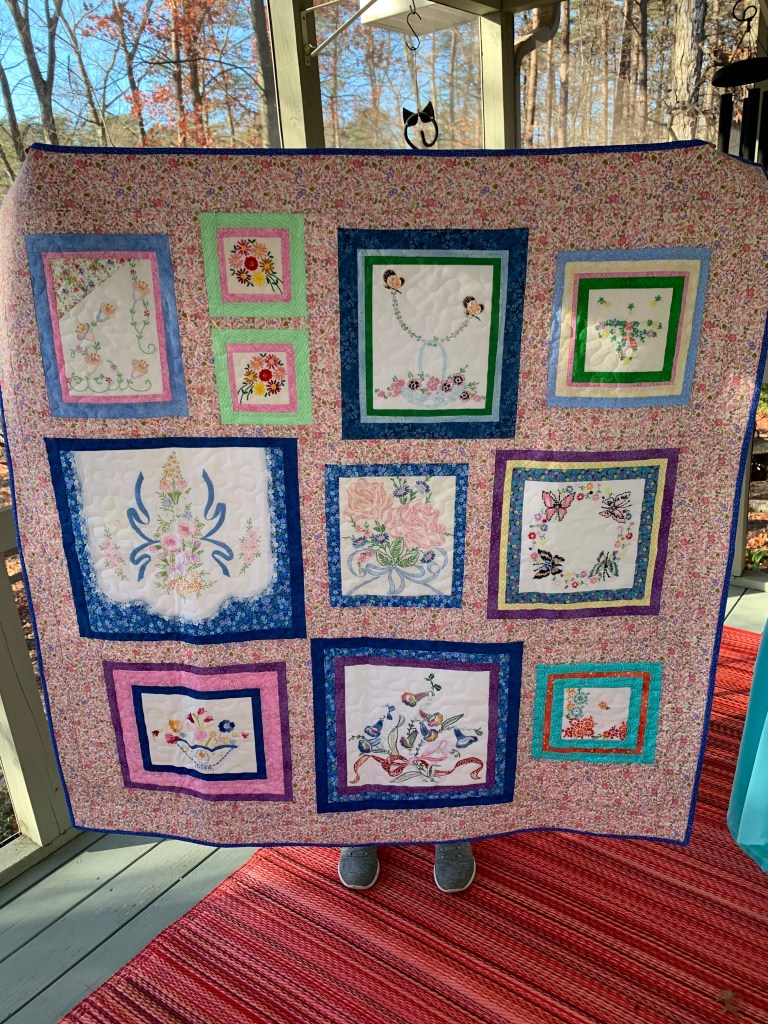 Now, how to put them together? I placed about a dozen blocks side by side, making a solid piece, but I immediately saw that the embroidery had disappeared, and the result was busy. I wanted each piece to stand out, so I used 1/2″ sashing. I then chose a darker border, which I felt made the whole thing pop. (The border has a navy blue background).