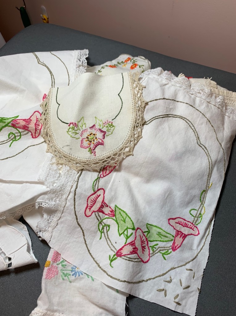 For many years it has been a hobby of mine to search antique shops and yard sales for discarded embroidery pieces, preferrable damaged ones because I find it difficult to cut into someone’s pristine work. 2023 was the year that I decided to do something with a few of these treasures.