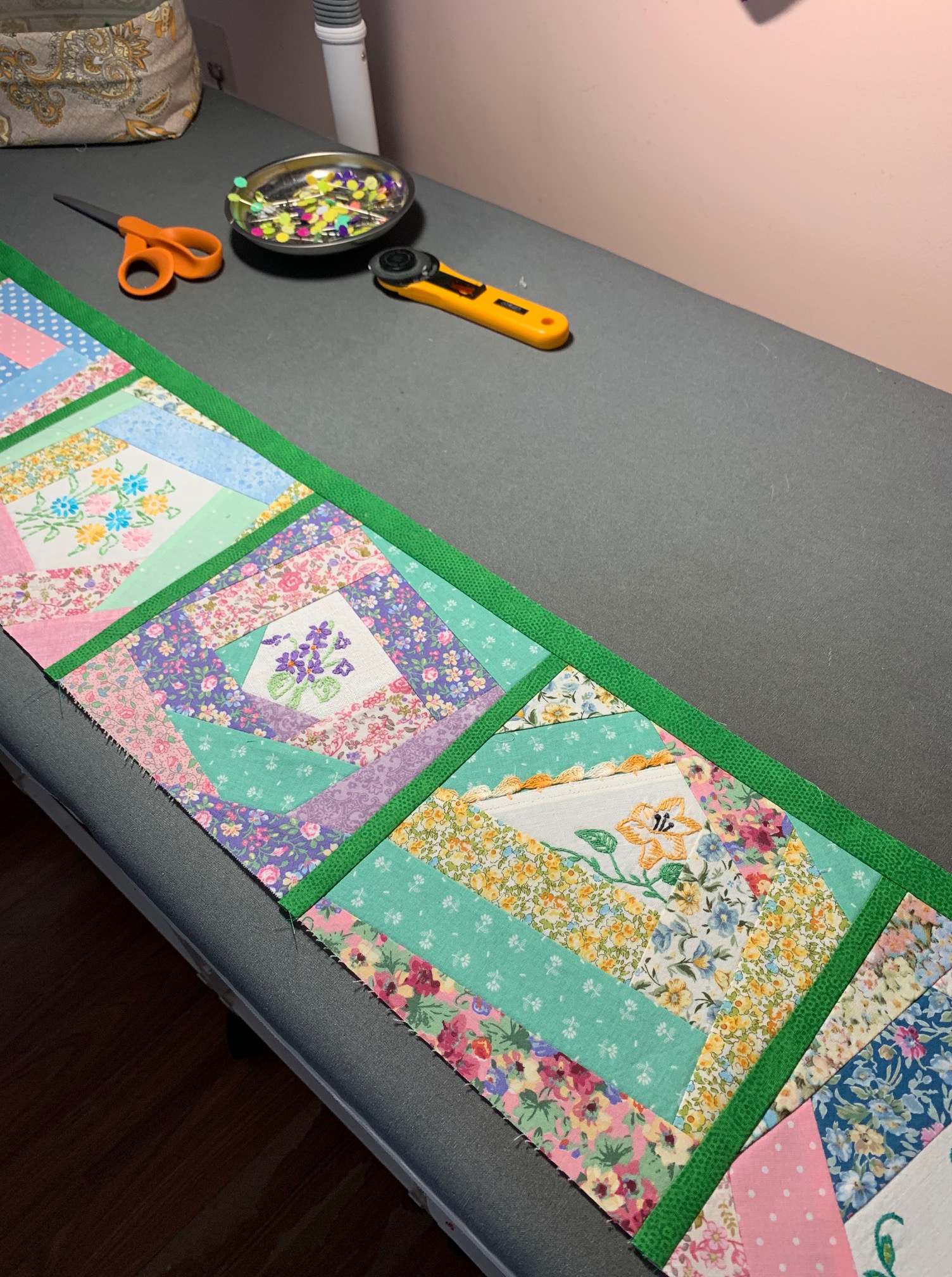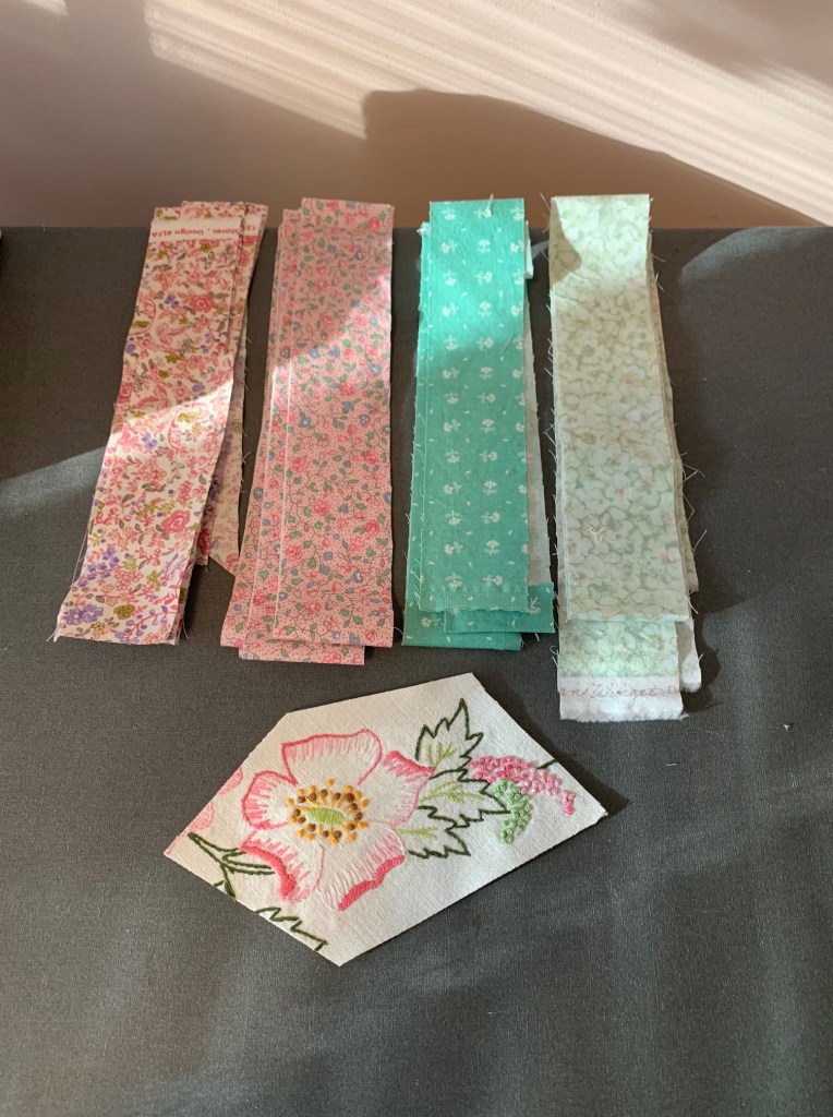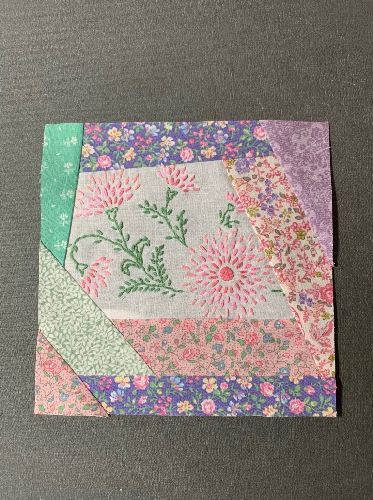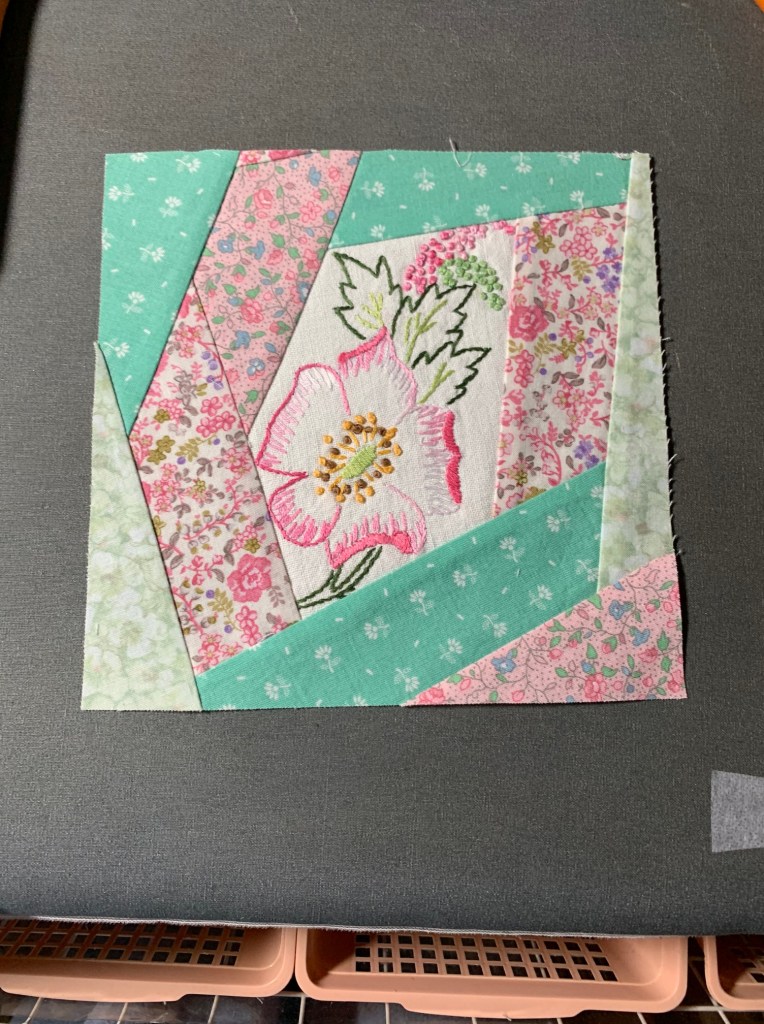 Using 2″ strips of fabric and embroidery that have been cut to have 5 sides, place a strip on each side going around counterclockwise (think log cabin). Repeat until it is at least 8″ wide and 8″ long (or whatever size you are making). I made mine 7″ finished so I then laid my 7 1/2″ template on the block and trimmed.
