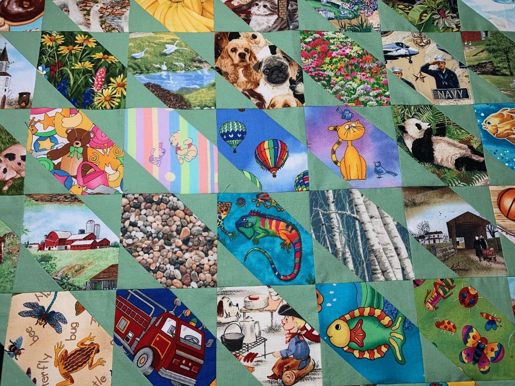 I thought one of the advantages of this project would be making a dent in my stash. But as it turned out, I ended up ADDING to my stash instead of reducing it. I explored all of my favorite online fabric stores for child-friendly fabrics and found dozens that I couldn’t resist. So I will stop rambling now and show you some of the results of my past year in the quilt room: